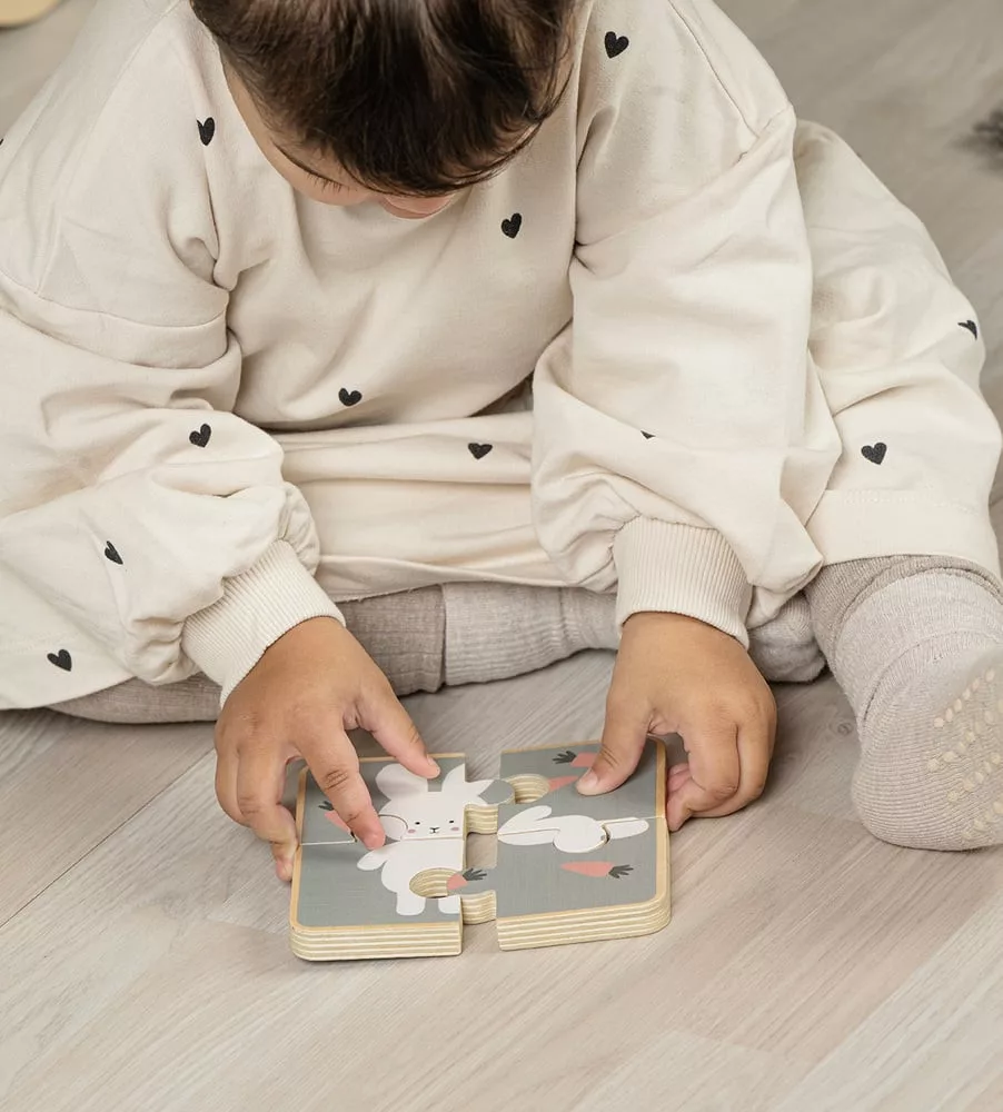 Kirakós játék: Kétoldalas puzzle, amelynek mindkét oldala különböző témájú, így sokoldalú játékélményt nyújt. Az egyik oldalon egy színes puzzle, a másikon pedig egy nyúl puzzle található.