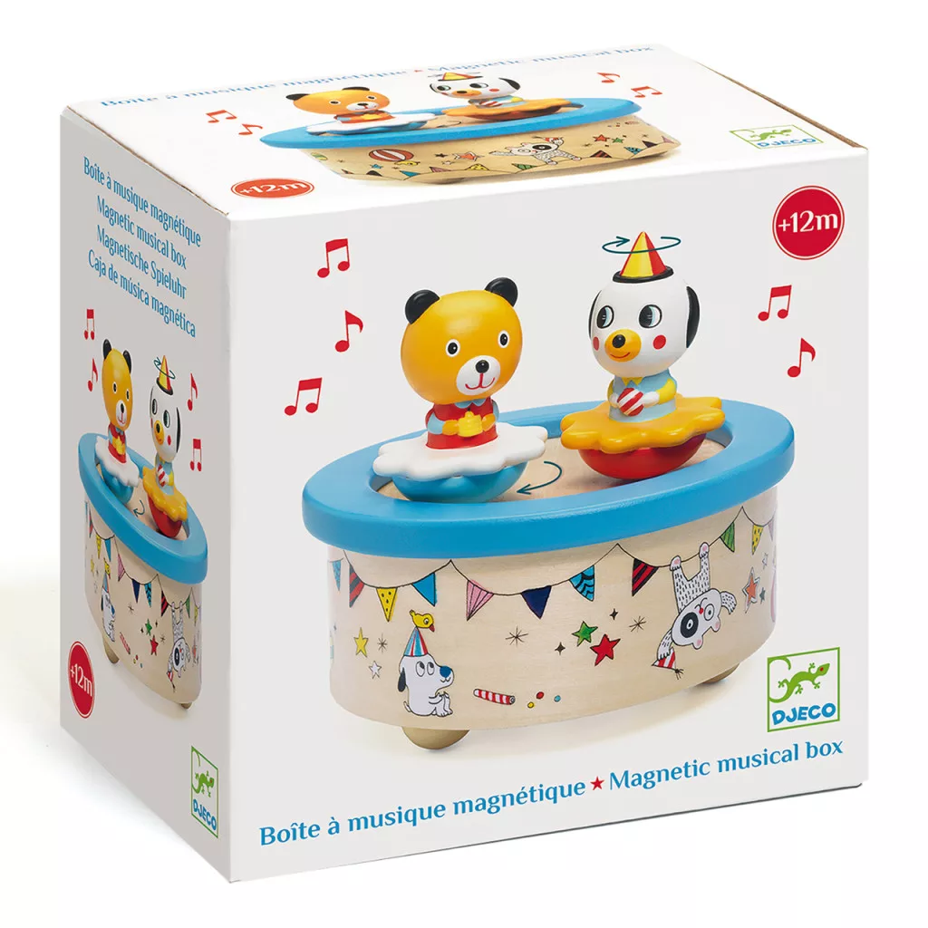 A két bájos babafigura Schubert Bölcsődalának dallamára forog a zenedoboz tetején. Zenére táncolnak, de önálló játékra is alkalmasak, ha éppen a kisgyermek babázni akar velük.