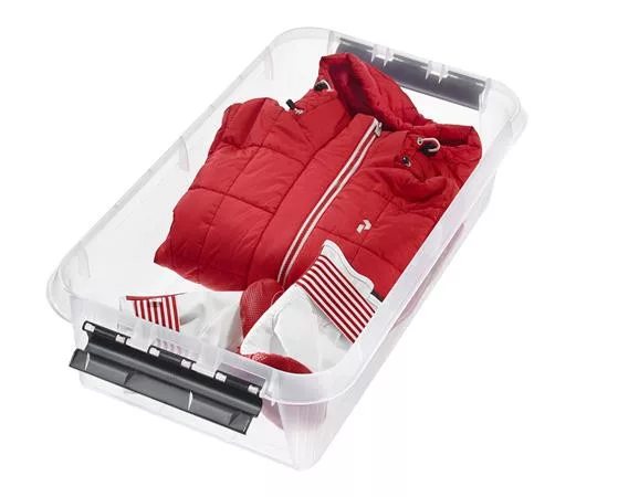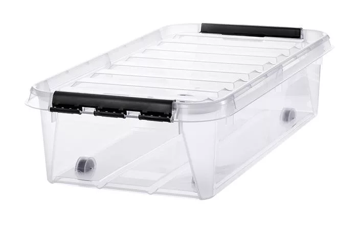 Műanyag tárolódoboz, 31 liter, fekete fogantyúkkal és görgőkkel, SMARTSTORE "Classic 35", átlátszó