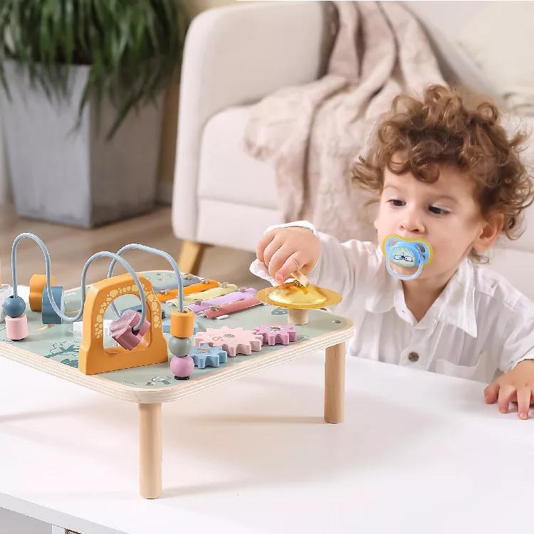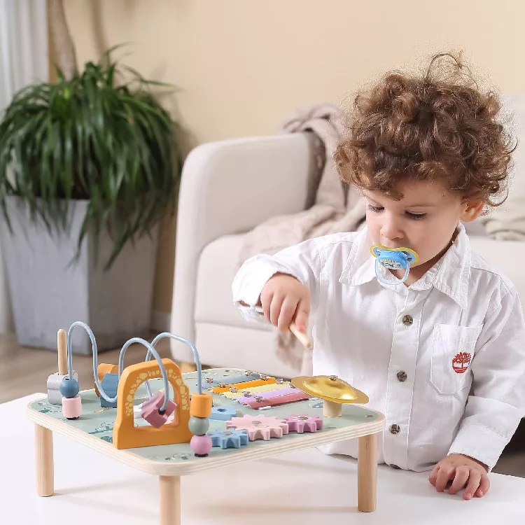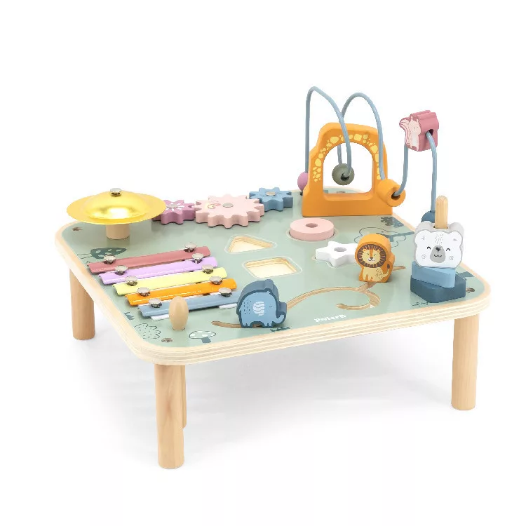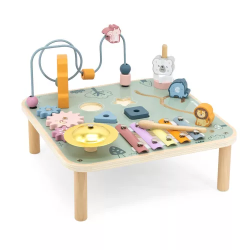 Az asztalon megtalálható a klasszikus és népszerű golyóvezető, a formakereső játék, metalofon, cintányér, állatos útvesztő játék és fogaskerekek.
