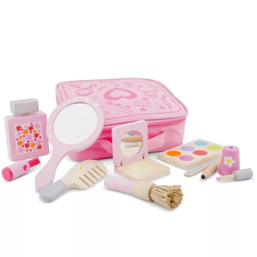 A New Classic Toys fa smink szettje egy aranyos, kompakt táskában érkezik, melyben mindent megtalálsz: rúzs, tükör, szemhéjfesték, körömlakk, parfüm, hajkefe, púderecset és egyéb ál-smink eszközök. A készlet szerepjáték közben segíti a kreativitás, finommotorika és utánzókészség fejlődését. Az összes eszköz biztonságos, fából készült, nem hagy foltot vagy nyomot.