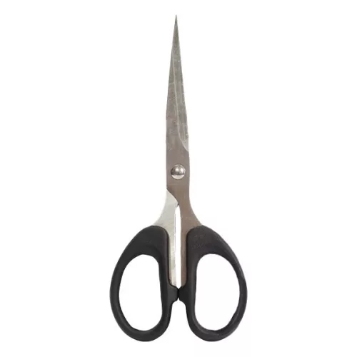 Hegyes végű, rozsdamentes acélból készült, műanyag nyelű olló. Hosza 16cm.