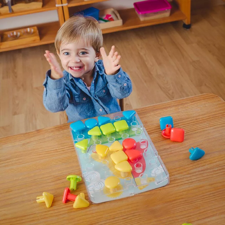 Négyféle alakú, négyféle színű gombokat kell bepattintani az átlátszó táblára a minták alapján. Ebben a készletben a pötyizést megkönnyíti a mintalapon a jel, hogy a pötyi tüskéjét hova kell beszúrni.
