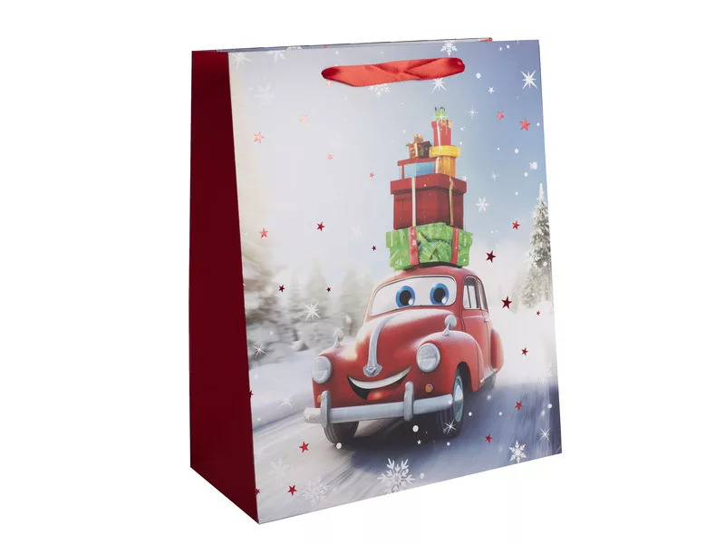 Dobd fel az ünnepi ajándékozást ezzel a különleges karácsonyi mintás ajándéktasakkal, amely egy vidám piros autót ábrázol, tetején ajándékcsomagokkal, havas tájban. A grafika barátságos és látványos, így ideális választás lehet gyermekeknek szánt ajándékok csomagolásához, de bármilyen karácsonyi meglepetést stílusosan bemutathatsz benne.