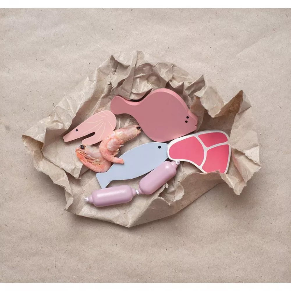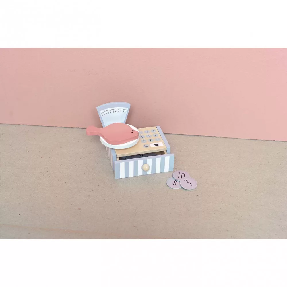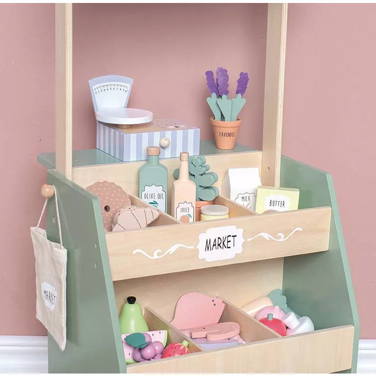 A vásárlás még soha nem volt ilyen szórakoztató! Amikor a vásárló befejezte a válogatást, a mérleg és a pénztárgép segítségével kiszámolhatod, mennyit kell fizetnie. Az ételeket könnyedén becsomagolhatod a bevásárló táskákba, mely a stand oldalára lett felakasztva.