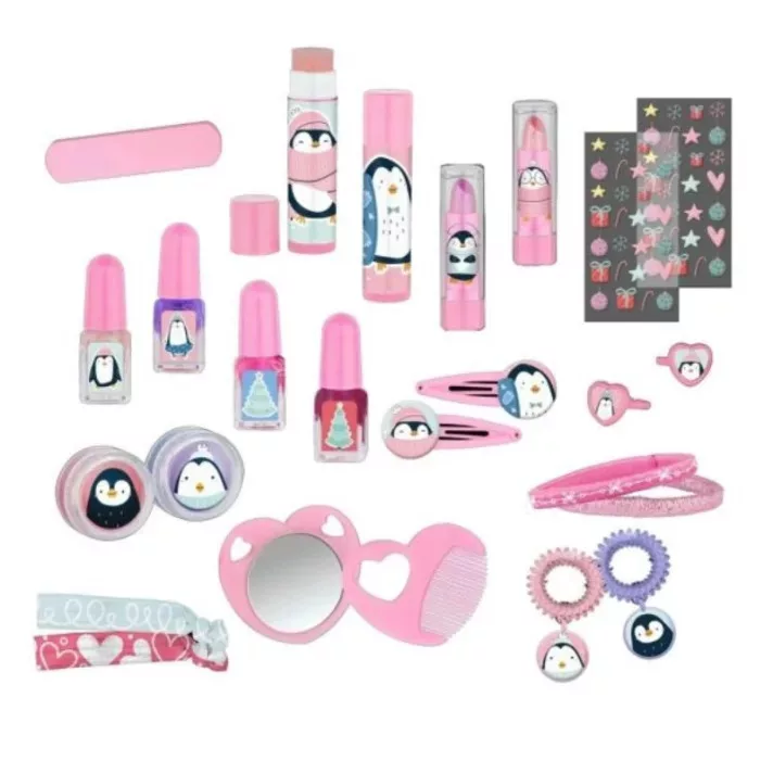 Pingvinek a hóban adventi szépségkalendárium gyerekeknek. Tartalma: 1 db hajcsat, 2 db spirál hajgumi, 2 db gyűrű szív alakú charmmal, 2 db ajakbalzsam, 2 db rúzs, 2 db hajbavaló, 2 db csillámos festék, 2 db hajgumi, 1 db körömreszelő, 2 ív körömmatrica, 4 db körömlakk, 1 db szív alakú tükör, 1 db szív alakú fésű.