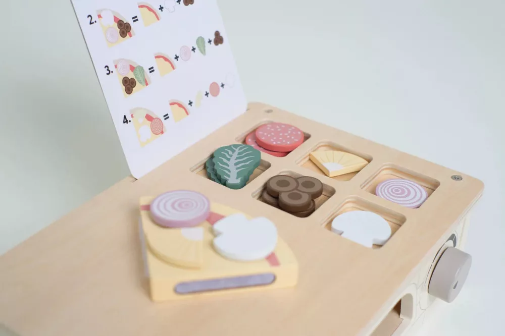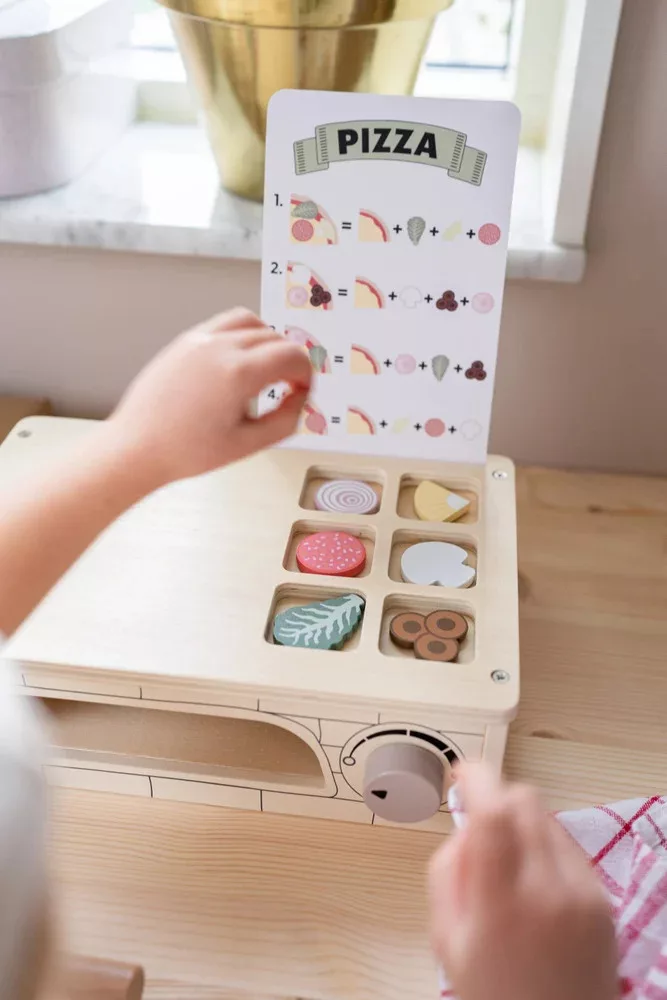 A Jabadabado fából készült pizzasütő tökéletes játék minden kis pizzakészítő számára. A feltéteket tépőzárral könnyen a pizzára lehet rögzíteni. Tálald ezt a fantáziadús pizzát úgy, ahogyan csak szeretnéd az összes ízletes kiegészítővel, vagy kövesd a mellékelt menükártya receptjét.