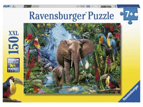 Gyönyörű, színes kép az esőerdő állatairól elefánt mamával és kiselefántjával a középpontban. A Ravensburger® már 1891 óta gyártja puzzle képkirakó termékeit.