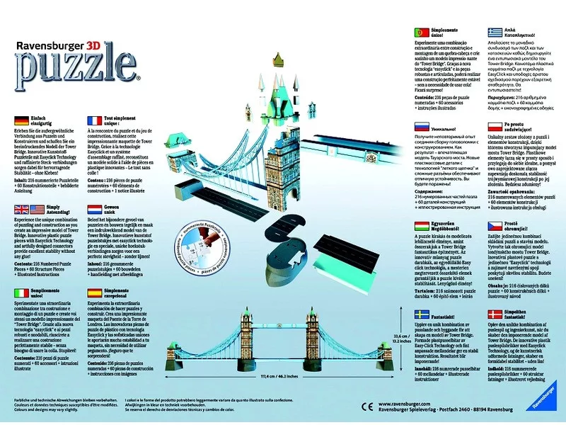 Rakd össze London egyik ikonikus építményét, a Tower-hidat! A Tower-híd 216 darabos 3D puzzle a Londoni Tower előtt lévő, a Temze folyót átszelő hidat mintázza, felnyitható autóutakkal. A híd erős mozaikdarabokból rakható össze, ragasztó használata nélkül. Némelyik darabok hajlíthatók, a hidat kezdők és haladók is bátran összerakhatják! A Tower-híd 216 darabos 3D puzzle kirakott méretei: 117 x 17 x 34 cm.