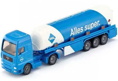 Vidd az üzemanyagot a benzinkútra tartálykocsiban! A Siku: benzinszállító tartálykocsi egy kék színű MAN vontató, Aral feliratú tartálykocsival kiegészítve. Az utánfutó lekapcsolható, a kamion fémből és műanyagból készült, részletes kidolgozottsággal. A Siku: benzinszállító tartálykocsi együtt használható más 1:87 méretarányú Siku játékokkal is! Méretek: 17 x 4 x 5 cm.