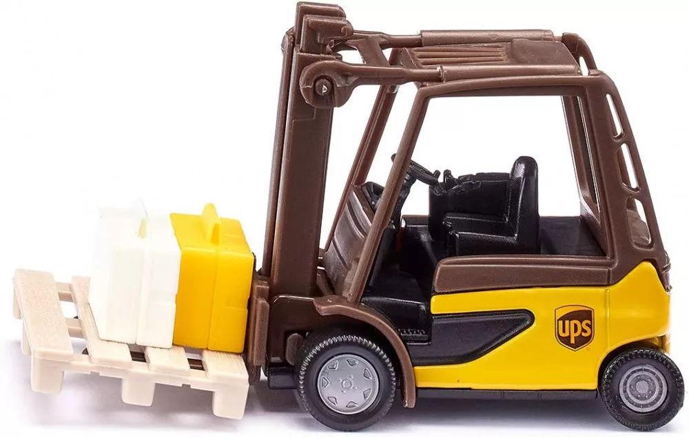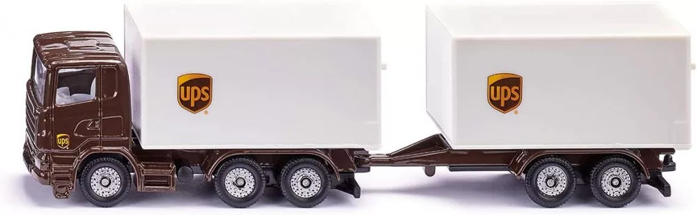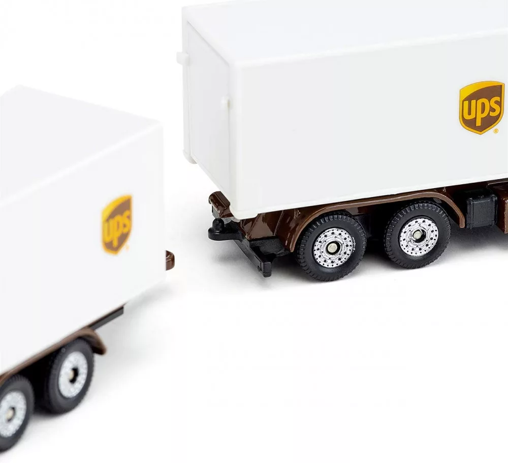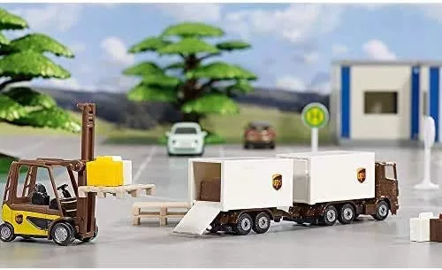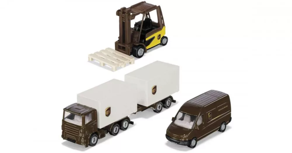 A UPS logisztikai készlettel a csomagkézbesítéssel kapcsolatos komplex logisztika könnyen érthetővé és izgalmas témává válik. A készlet egy targoncából, egy 3 tengelyes traktorból és egy transzporterből áll, a tipikus UPS színekben.