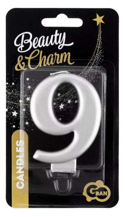 Ezüst 9-es Metallic számgyertya, tortagyertya