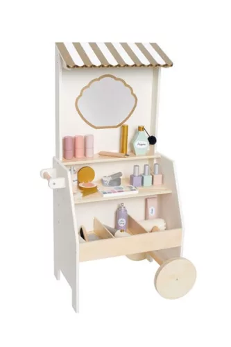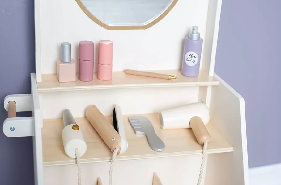 Minden tartozék fából készült a maszatmentes játék érdekében. A szépségszalon kerekekkel és fogantyúkkal rendelkezik, így könnyen mozgatható, a két polcon pedig minden smink- és hajápoló termék tárolható. Összesen 26 különböző luxus tartozékot tartalmaz.
