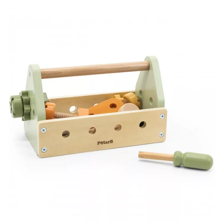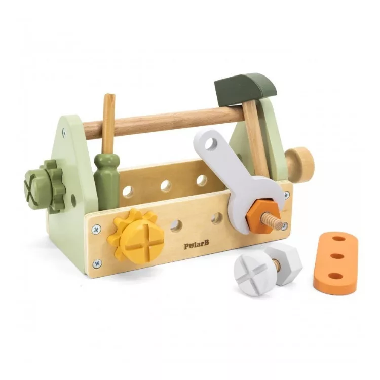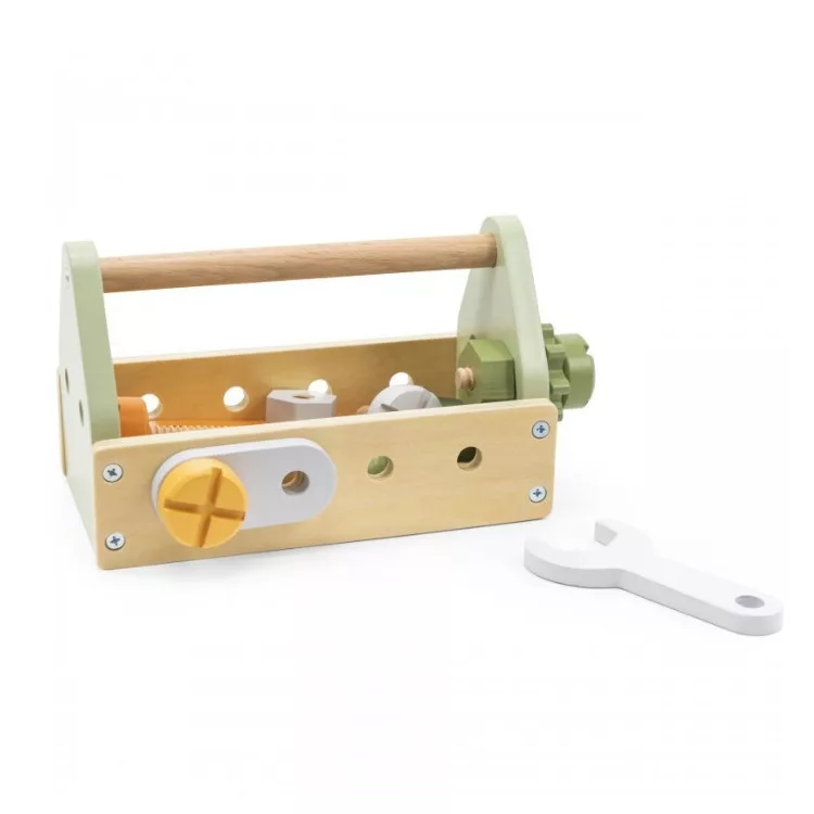 Szerszámos láda szerszámokkal, építőelemekkel és csavarokkal, fa dobozban. Építés és barkácsolás közben a gyerekek megismerkednek a szerszámok elnevezéseivel és használatával.