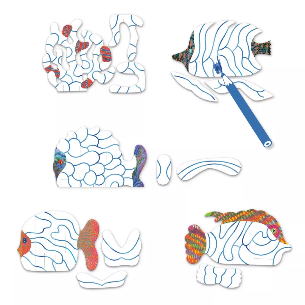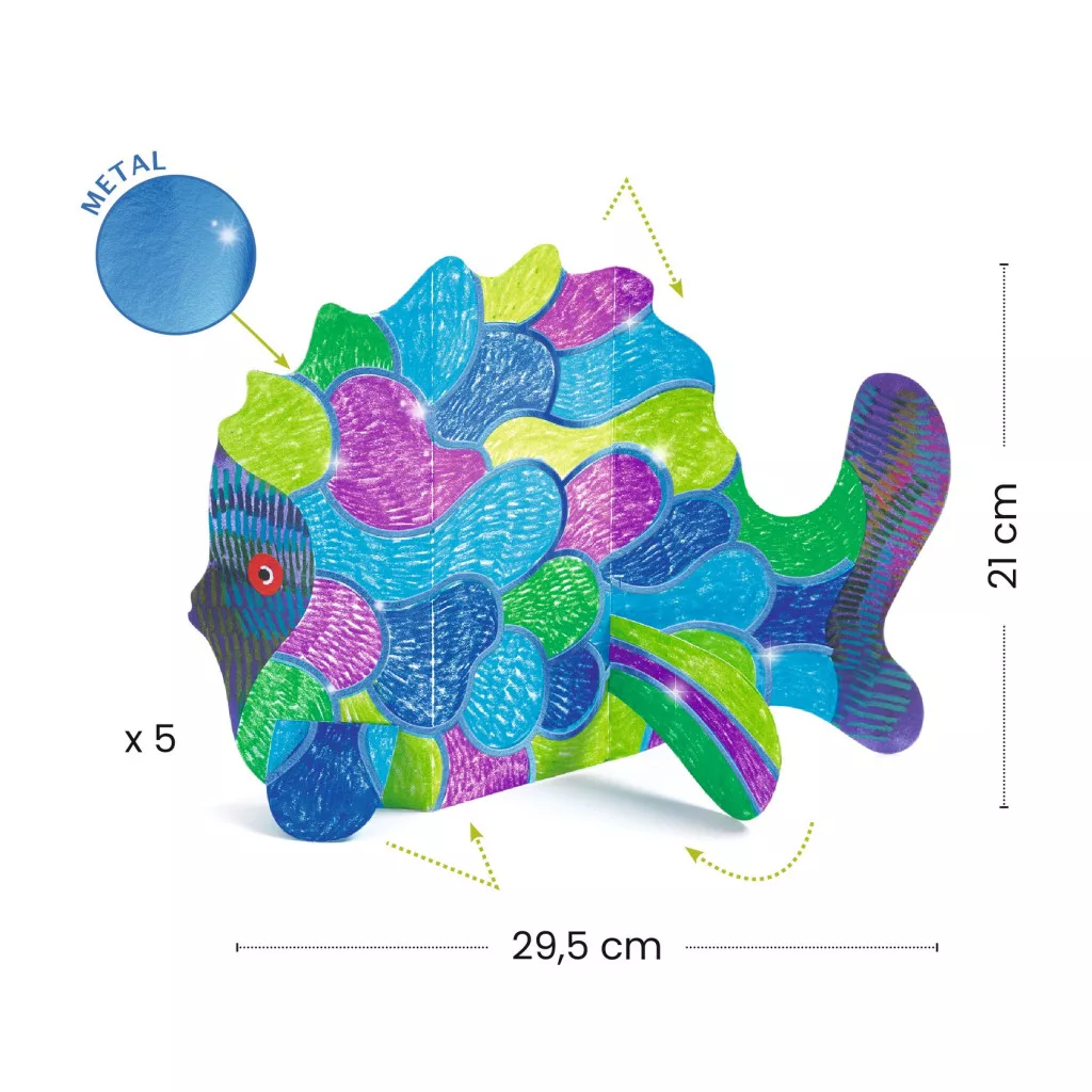 Kreatív színező készlet a dobozban, amelyből csodálatos tengeri világot hoz létre a gyermek! Először színezi, majd összehajtja és összeszereli a darabokat. Megjelenik egy tengeri világ, amely a fémes színezéken visszaverő fényeknek köszönhetően szinte világít.