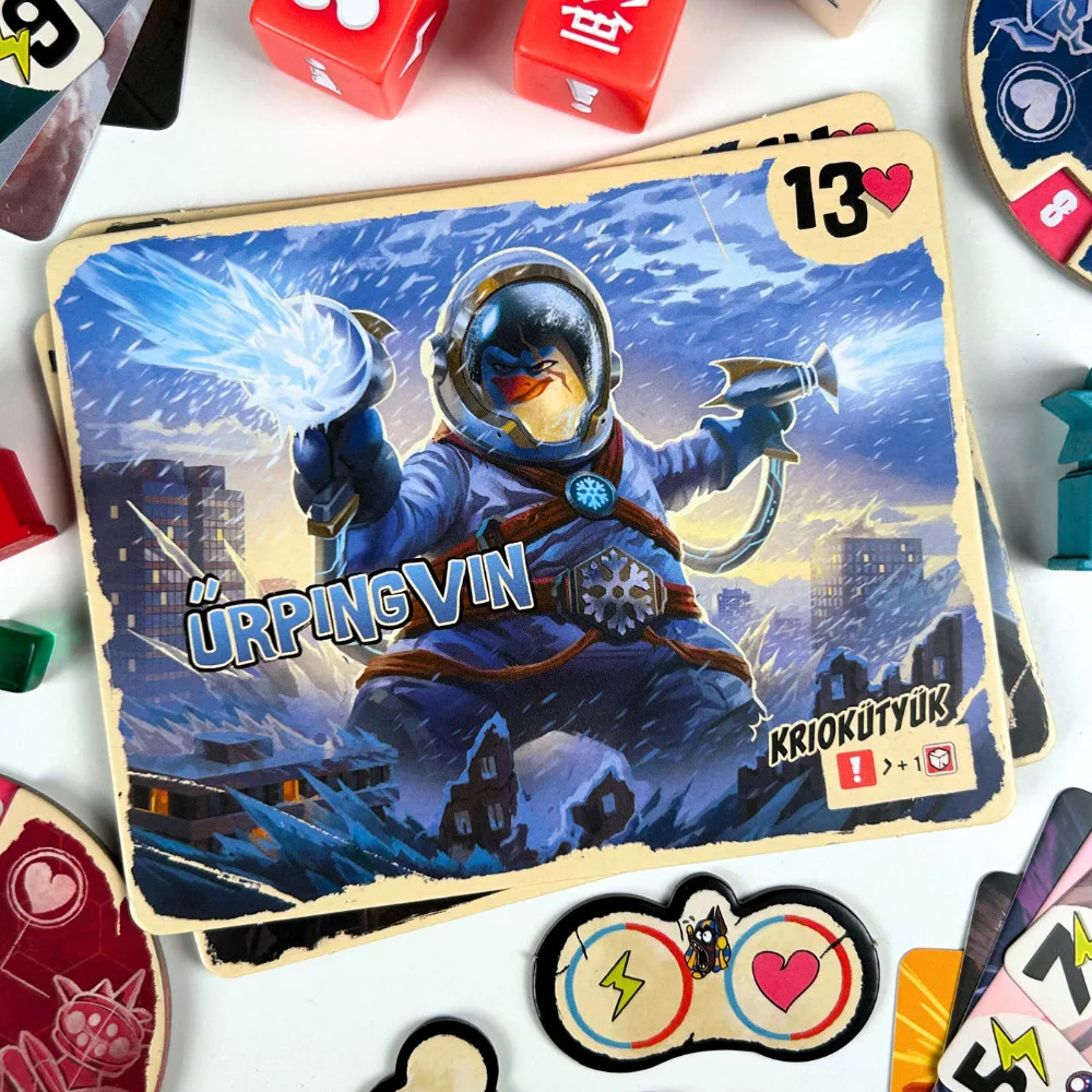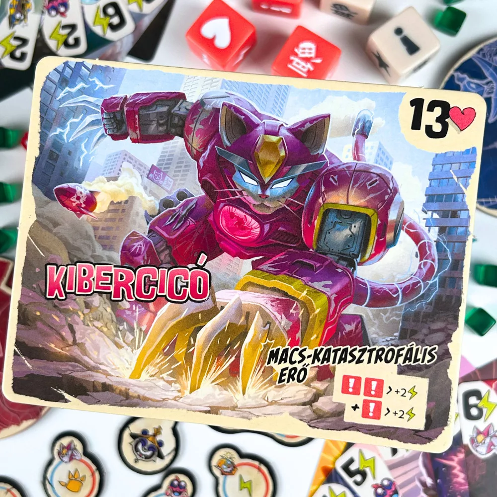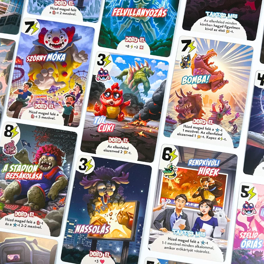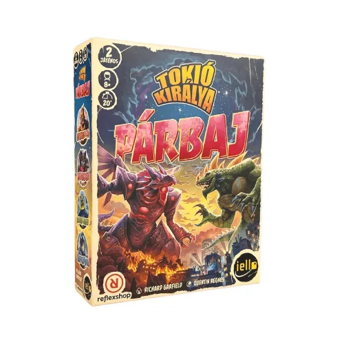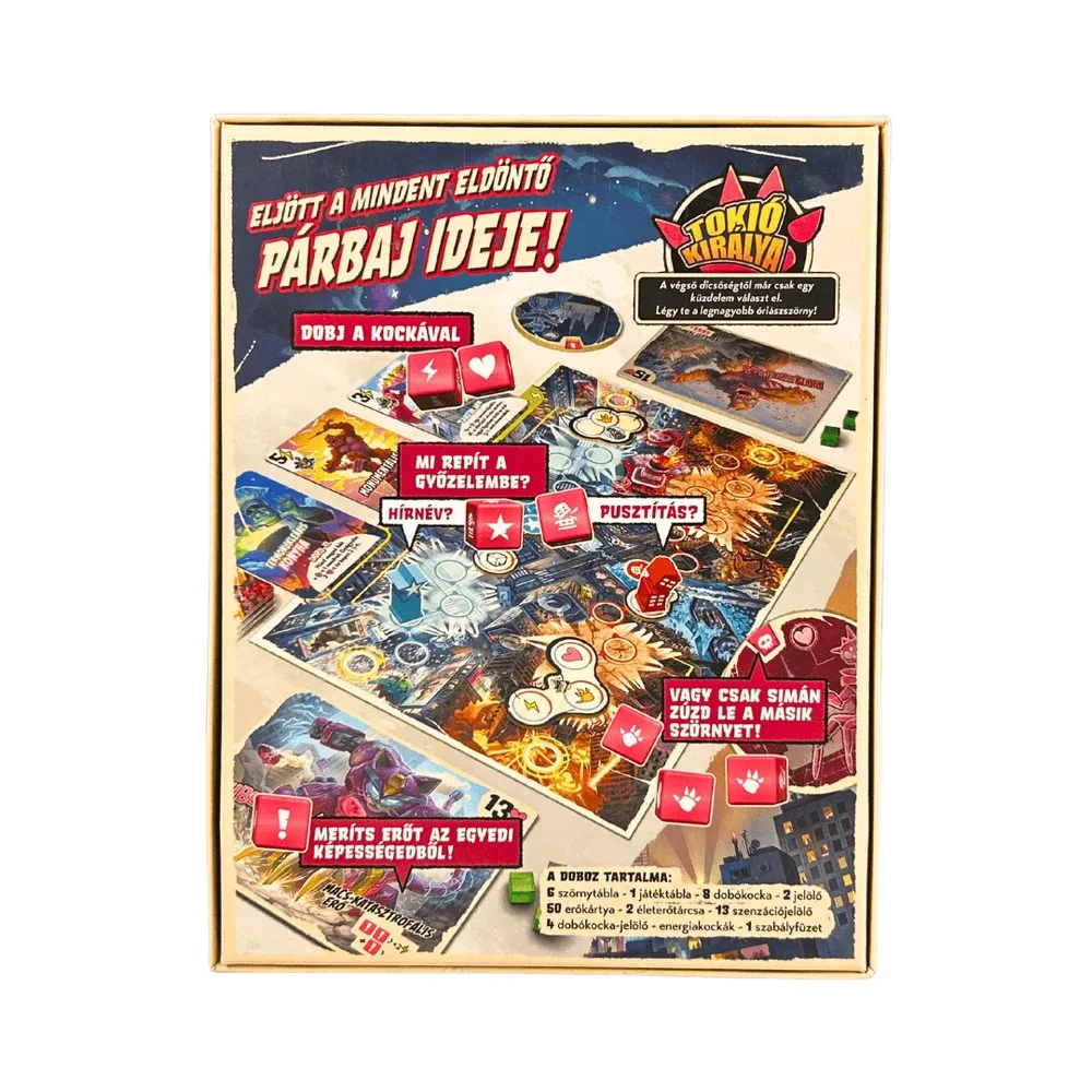 A Tokió Királya párbaj a már-már klasszikusnak számító társasjáték kétfős változata! Válaszd ki egyedülálló képességekkel rendelkező szörnyedet, és dobj új kockákat, hogy magad felé húzd a hírnév és a pusztítás jelzőit - igen ez egy igazi kötélhúzós kockajáték! De ne feledkezz meg az új különleges erőkártyákról sem! Itt az ideje, hogy Tokió királya légy!