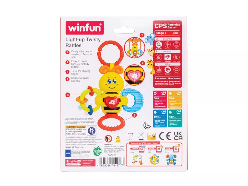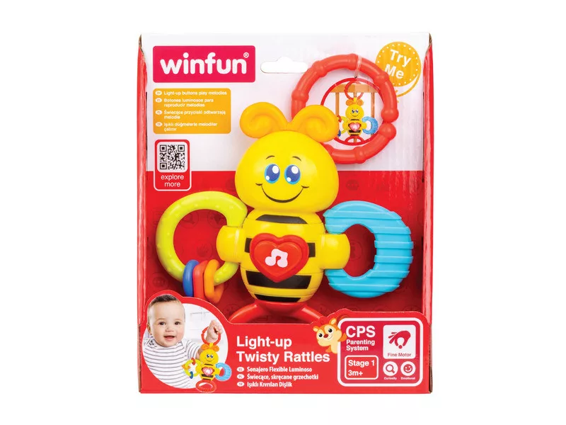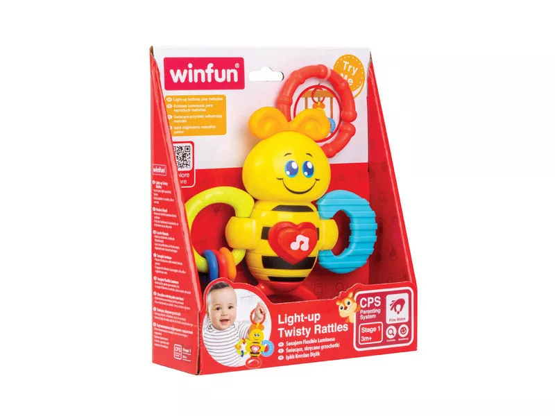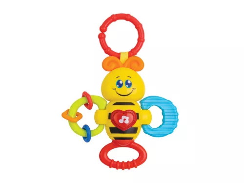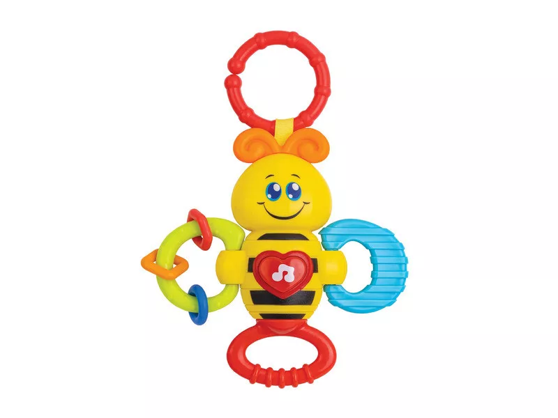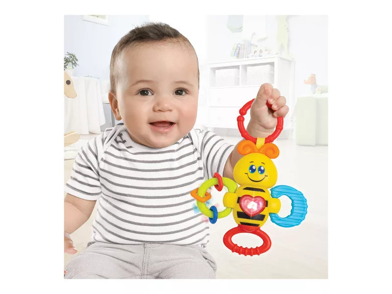 A barátságos, színes méhecske formájú játék ergonomikus kialakításának köszönhetően könnyen megfogható a legkisebb kezek számára is. A különböző textúrák fejlesztik a tapintási érzékelést és a kézügyességet, miközben a fények és színek támogatják a vizuális érzékelés fejlődését.