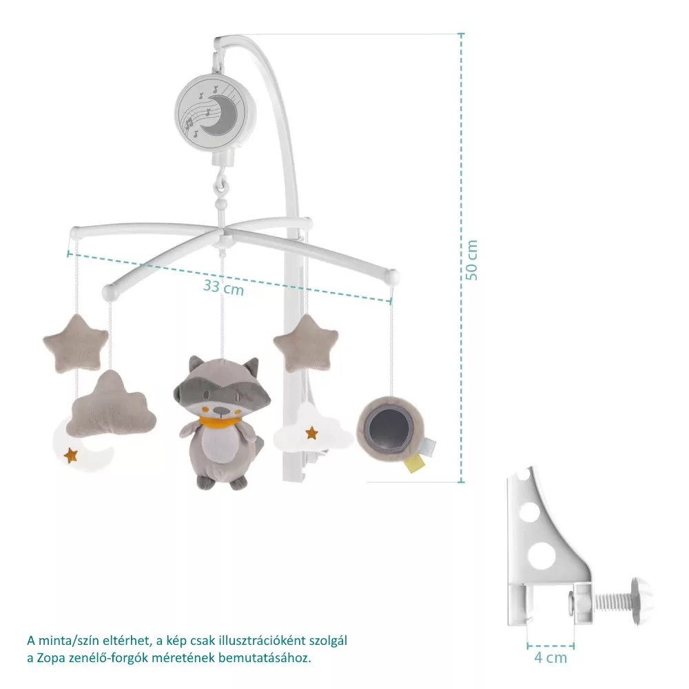 A babák könnyebb elalvása érdekében, valamint, hogy az édesanyák számára az altatás a béke és a nyugalom pillanatai legyenek, a gyermekszobából nem hiányozhat a gyerekágyra szerelhetõ forgó. A Zopa zenélõ-forgó nem csak a babaágy szép díszítõ eleme, hanem egyúttal a baba megszületéstõl kezdõdõen játék és elalvási segédeszköz is.A forgón található természetes motívumú, vidám színû plüss játékokat, valamint az azok között domináló aranyos kisállatot kellemes, édes dallam kíséri. Mindezek elõsegítik a baba hallásának, látásának és motorikai képességeinek fejlõdését. Kellemes légkört teremt az ágyban, amely megnyugtatja a babát, és lassan elvezeti az álmok birodalmába.A forgót szabványos kiságyakra tervezték, a felszerelése nagyon egyszerû. Utazóágyra is felszerelhetõ. A felhúzható zenegép elem nélkül mûködik. A minõségi, egészségügyi szempontból ártalmatlan anyagból készült, puha, kellemes tapintású plüss játékok könnyen leakaszthatók a forgóról, és így kis kedvencekké, barátokká is válhatnak.-Esztétikus játék és altató jó barát minden babaágyba-Újszülött kortól használható-Mérete: 49 x 42 cmFigyelmeztetés: Amikor a gyermek már megpróbál a kezeire és a térdeire támaszkodni mászó helyzetben, a belegabalyodásból eredõ lehetséges sérülés megelõzése érdekében távolítsa el a játékot!