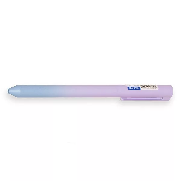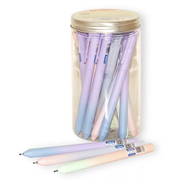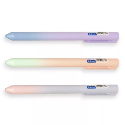 Irodai és általános felhasználásra ajánlott zselés toll. 0,5 mm írásvastagság; kék tintával ellátva, vegyes tolltest színek divatos színátmenettel. 30 db-os átlátszó kínáló pohárban.