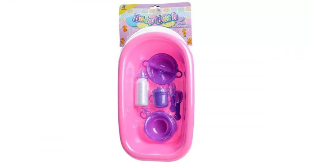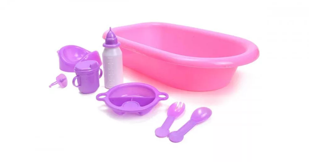 Ápold és etesd meg kedvenc babádat, és fürdesd meg a kádban! A Babakád etető készlettel csomagban egy rózsaszín vagy világoskék babafürdető lavórt találsz, kiegészítőkkel. A kis pohárból és cumisüvegből meg tudod etetni a picit, bilire tudod ültetni, a tálkában ételt tudsz neki adni. A Babakád etető készlettel minden játékbabával együtt használható, de legideálisabb a 36 és 42 cm hosszúságú babákhoz. A babakád és a kiegészítők is műanyagból készültek. Méretek: 39 x 24 x 8 cm. A játékok külön kaphatóak. A megjegyzésben kérjük tüntesd fel, hogy melyik változatot szeretnéd!