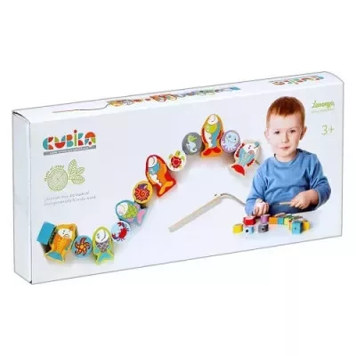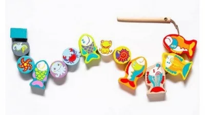 Készíts egy szép füzért fa halacskákkal! A Halacskák fa gyöngyfűző egy ügyességi játék, ami nagyban fejleszti a szem-kéz koordinációt, és a finom kézmozdulatokat is. A játék lényege, hogy a madzagra színes halacskákat kell felfűzni, amiket utána fel is lehet akasztani.A Halacskák fa gyöngyfűző juharfából készült, élénk festéssel, a játék egészségre ártalmas anyagot nem tartalmaz. Csomagolás méretei: 27 x 4 x 13 cm.
