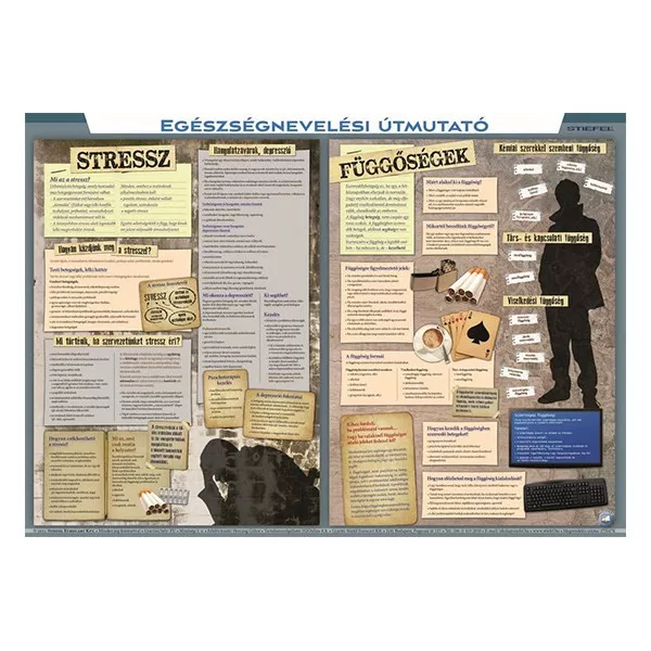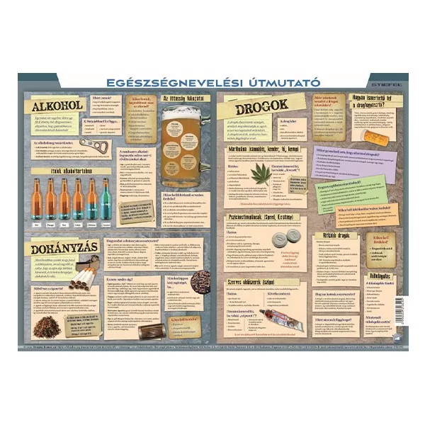 Egészségnevelés íróasztali alátétünk a fiatalok körében leggyakrabban előforduló problémákkal foglalkozik. Segítséget nyújthat a szülőknek vagy a pedagógusoknak a megelőzéshez, vagy ahhoz, hogy a már kialakulóban lévő probléma időben felismerésre kerüljön. A kemény fóliával bevont alátétek azonkívül, hogy esztétikusak és valódi térképként vagy oktatási segédletként használhatók, egy sor további előnnyel bírnak: védi az asztalt a karcolástól, egyenletes írásfelületet biztosítanak és vízállóak.