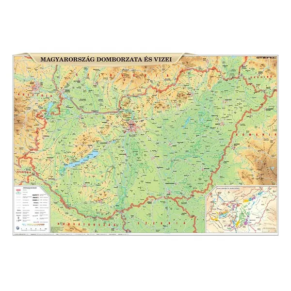 Részletesen ábrázolja Magyarország domborzati és vízrajzi viszonyait. Feltünteti az iskolai oktatásban fontos földrajzi neveket. Halvány vonallal ábrázolja a domborzatot a valóságban elfedő nagyobb városok és autópályák körvonalát. A Magyarország borvidékei melléktérkép további érdekes információként szerepel. Hazánk földrajzának megismerése mellett elengedhetetlen tágabb környezetünk megismerése is. A Kárpát-medence domborzatát bemutató térképünk is ezt a célt szolgálja.