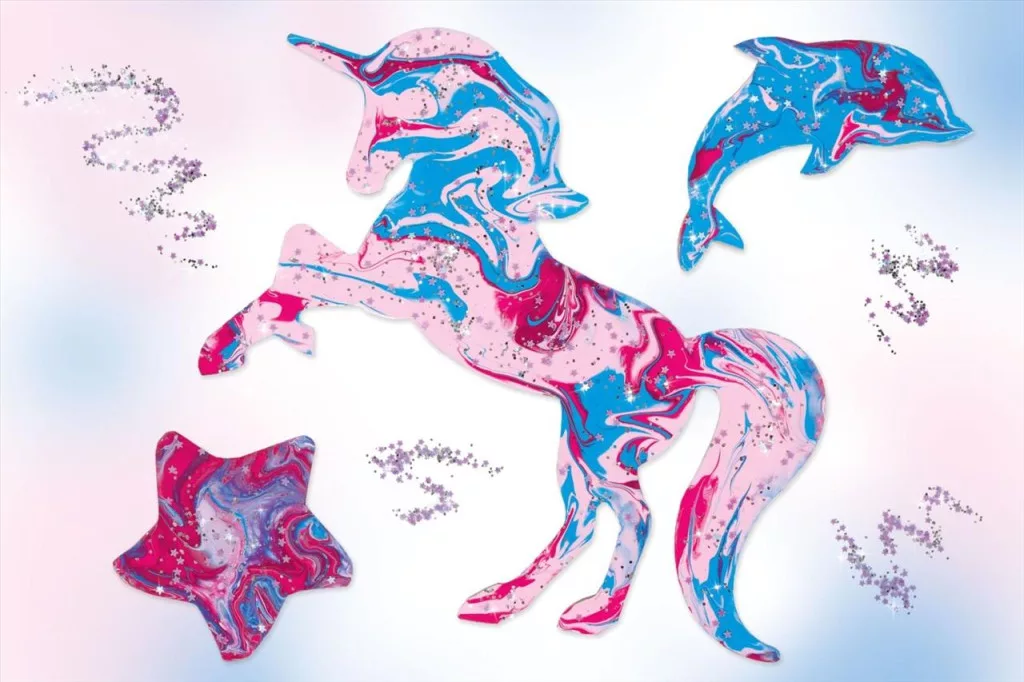 Ezzel a szetel elsajátíthatod a folyékony művészet készlettel, hogyan lehet lenyűgöző műalkotásokat létrehozni az élénk akril színek keverésével! Kövesd az útmutatót, és alkoss káprázatosan színes mintákat az unikornis, a delfin és a csillag formák felületén, hogy szobád egyedi díszei legyenek. Legyél kreatív !