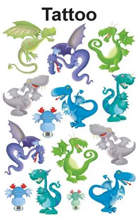 Óvakodj a sárkánytól! Lepje meg gyermekeit nagyszerű sárkány tetoválásokkal. Nem lesz gondja a következő születésnapi bulival, ha beveti ezeket a különböző méretű és színű tetoválásokat. Ideális sárkány idomároknak...