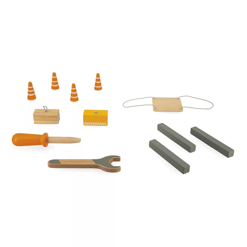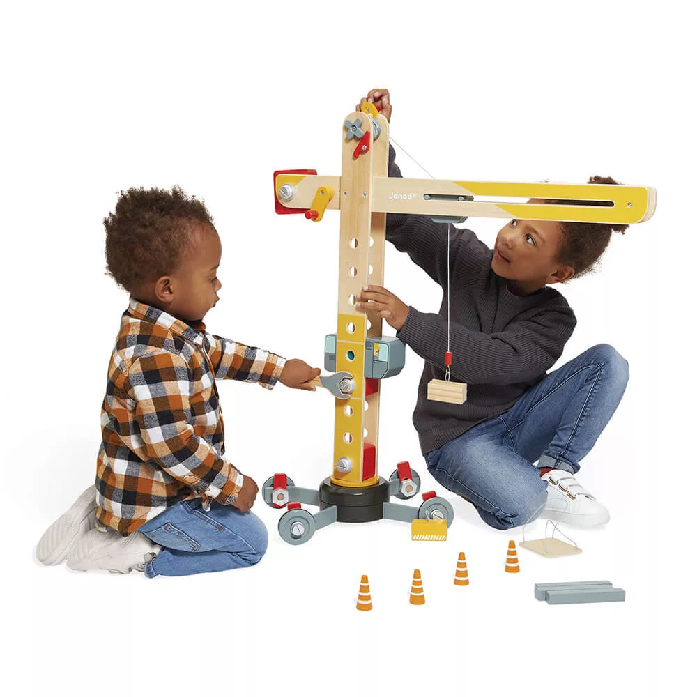 Ez a 74 cm magas daru lesz mindenjáték középpontja. Először is össze kell szerelned ezt a játékot,  amely örömet okoz a kis építőknek. Ez a nagy mobil daru 4 keréken gurul, amelyek stabilizálják a szerelvényt. Egy blokkoló rendszer megakadályozza, hogy a gép elmozduljon, amikor a gyermek úgy dönt. Az emelő nagyon könnyen kezelhető a daru tetején található 2 hajtókarnak köszönhetően. Ami egy igazi darut illeti, lehetővé teszik egy gondola emelését és irányítását, amely az építkezéseken szükséges összes nehéz felszerelést szállítja! Ez a csodálatos fa, narancs és piros tónusú daru 10 tartozékkal és 2 szerszámmal van felszerelve. FSC® fából (fenntarthatóan kezelt erdőkből származó fa) készül.