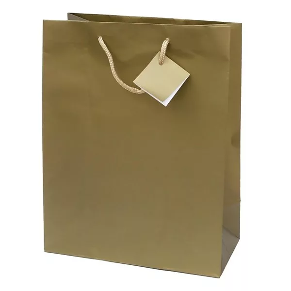 Ajándéktasak, M 18 x 23 x 10 cm méretben, arany színben, zsinór füles, ajándék kísérővel.