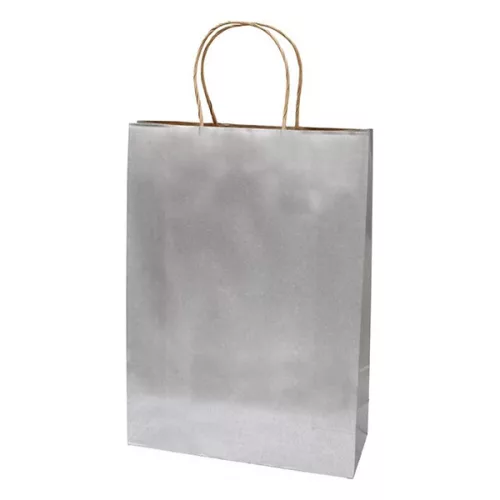 Ajándéktasak, XL 31x42x11 cm méretben, ezüst színben, sodort füles.
