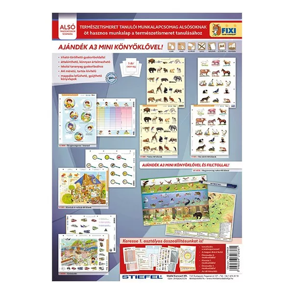 5 db FIXI tanulói lap 1 db Mo. vadon élő éllatai alátéttel és kék filctollal műanyag tasakban. A Fixi tanulói munkalapok a magyar oktatásban széleskörűen használt falitérképek és oktatótablók kicsinyített másai, nemcsak az órai munkát, hanem az otthoni gyakorlást is megkönnyítik. Minden munkalap írható-letörölhető, cseppálló fóliabevonattal készül, a lyukasztás pedig megkönnyíti a gyűjtését és tárolását a lapoknak. Magyarország vadon élő állatai kétoldalas alátétün,k a három fő élőhely – mezők, vizek, erdők – szerint mutatja be Magyarország állatvilágát a legapróbb részletekig élethű, eredeti rajzokon. Az alátét másik oldala hazánk térképén érdekesen szemlélteti, merre bukkantak fel mostanában a ritka fajok, továbbá pontos információval szolgál Magyarország összes állatkertjének, vadasparkjának és akváriumának hollétéről is.