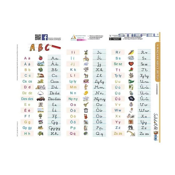 Az összes betűt (kis- és nagybetűket, ékezeteket) bemutató új tablónk készítésekor több, mint 1000 gyermeket kérdeztünk meg arról, hogy az egyes betűkről mi jut eszükbe. A rajzokkal illusztrált kiadvány hátán a vonal-elemek és az írott betűk gyakorlására van lehetőség. A tanulói munkalap írható-letörölhető fóliabevonattal készül!"